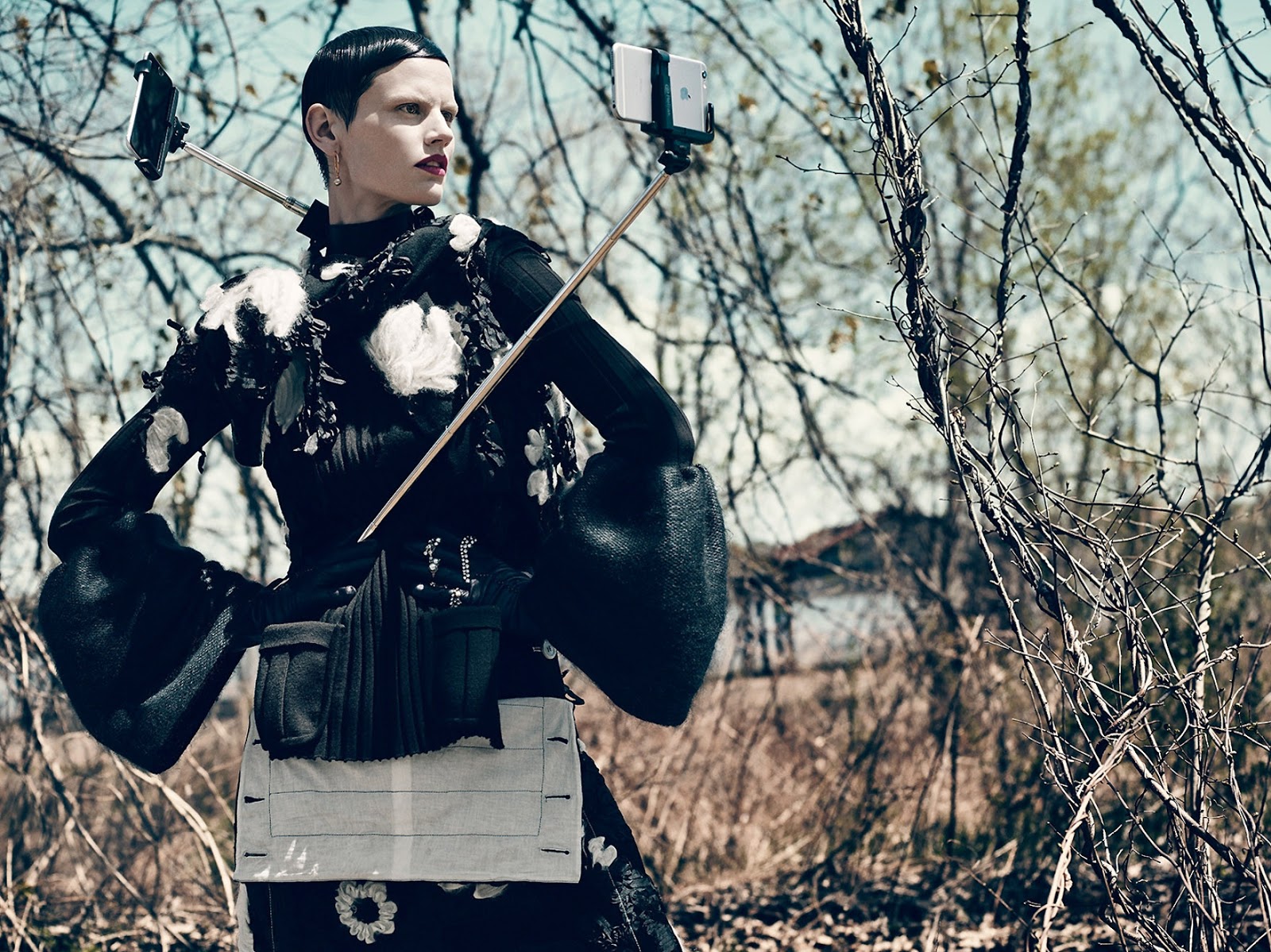 Selfie - In a mysterious and gritty setting Saskia de Brauw wears the likes of Proenza Schouler, J.W. Anderson, Junya Watanabe, & Maison Margiela, styled together by Karl Templer for July/August issue of Interview Magazine. De Brauw poses withe Apple phones and selfie sticks in imagery by Mikael Jansson. Make-Up by Mark Carrasquillo, Hair by Shay Ashual.